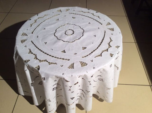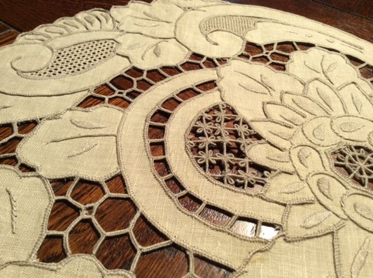 Linen tablecloths, Richelieu embroidery, purely handmade round beige 28cm