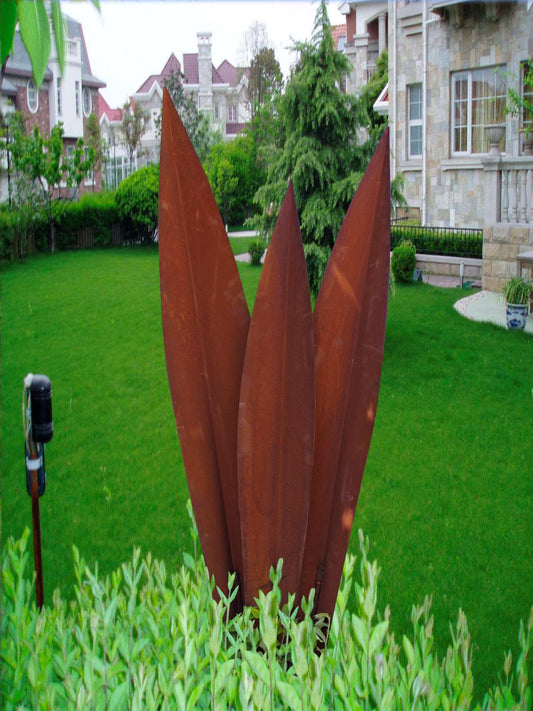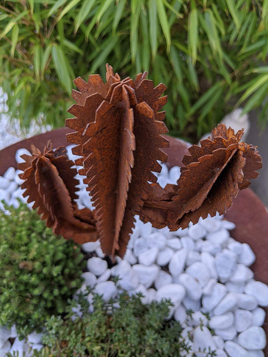 Edelrost Gartenstecker Beetstecker Skulptur ,aus Metall ,Drei Blätter inset , 3D