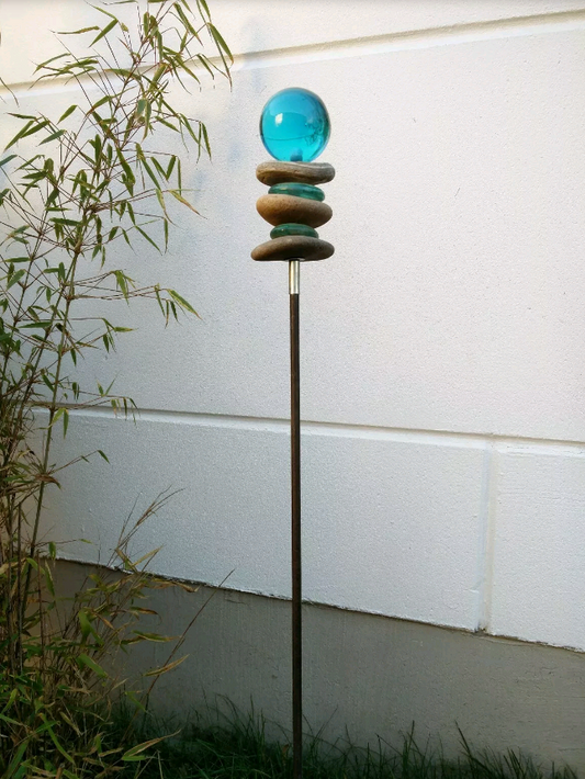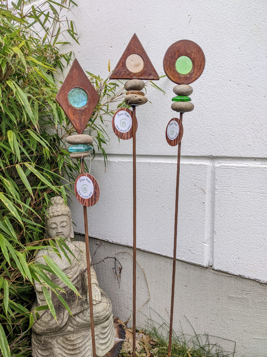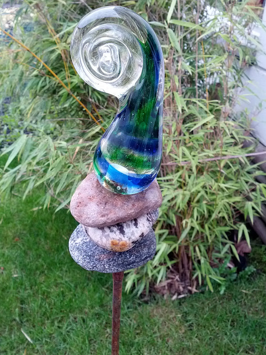 Edelrost Gartenstecker aus Metall , Glas , Naturstein