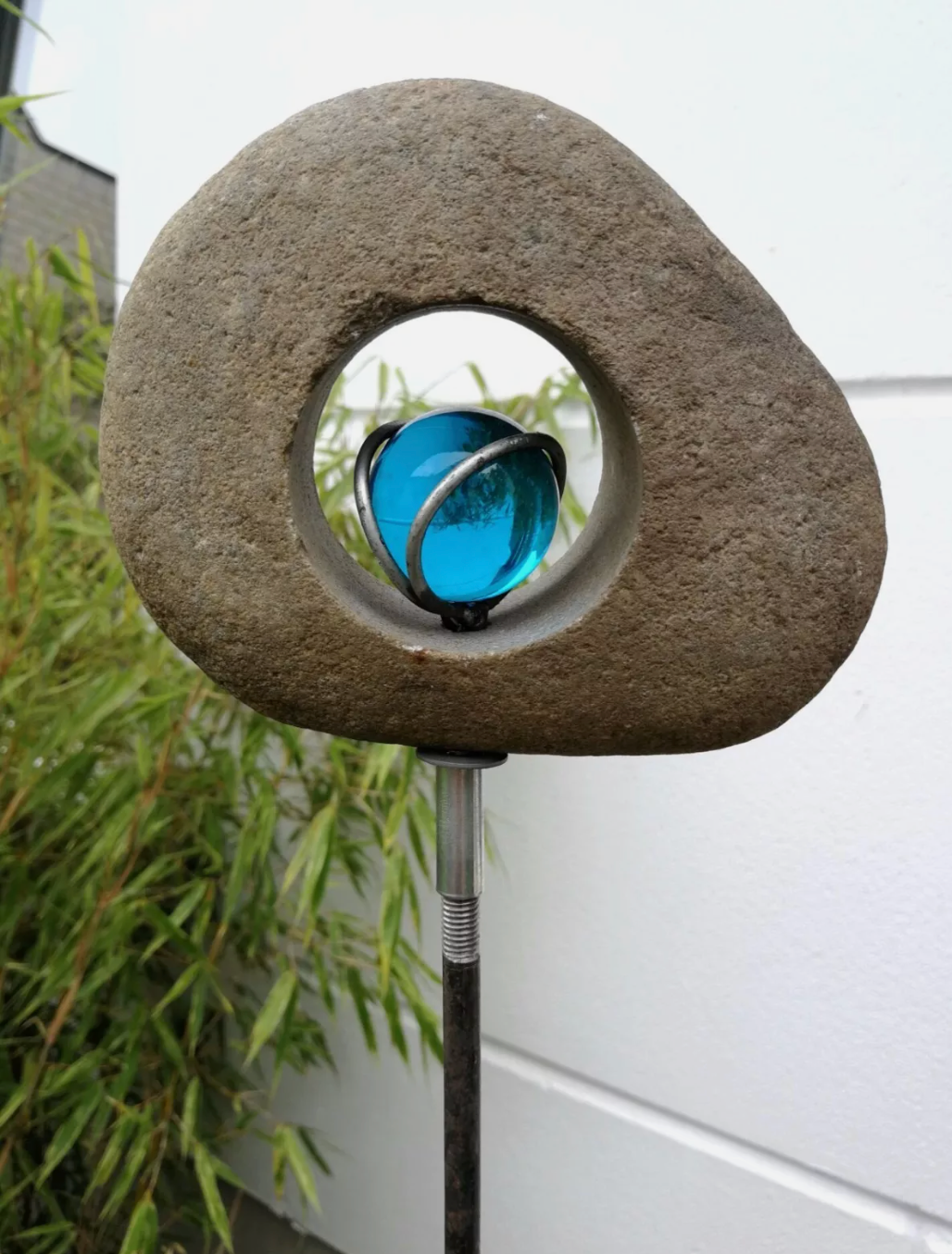 Gartenstecker Rost mit Glaskugel und Stein, Glasdeko